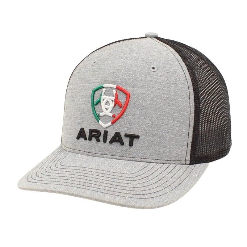 Comfy Ariat mens R112 cap by M&F Western Products. Grey front panels with Ariat shield logo in green, white, and red-the colors of the Mexican flag. Black mesh with snapback closure for a perfect fit.