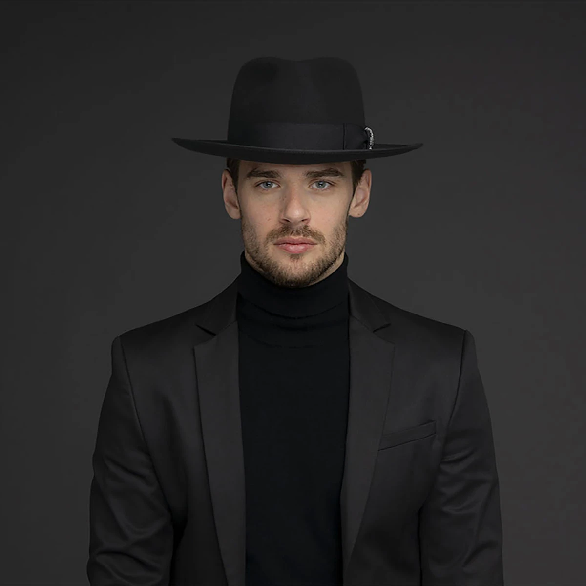 Auman is a vintage inspired Fedora, featuring a raised front teardrop crown with a 2 3/4″ Brim. Crafted from a blend of Rabbit Fur and Beaver Fur, this Superior Fur Felt style is trimmed with a Japanese grosgrain band with a chain link detail. It is fully lined and finished with a Fine Woven Sweatband.