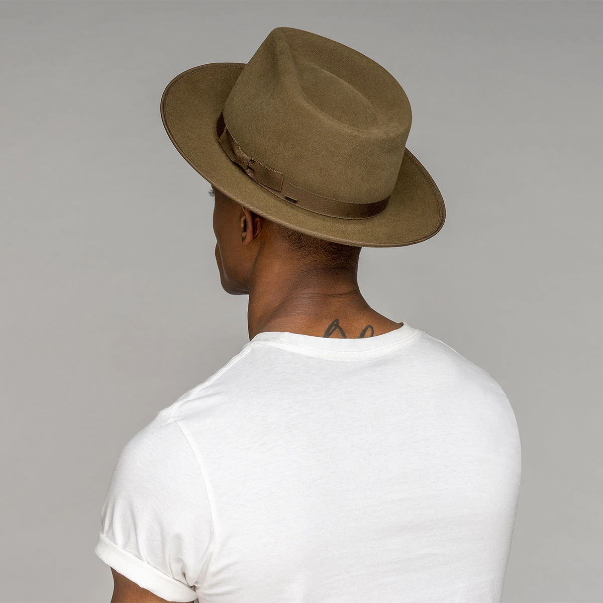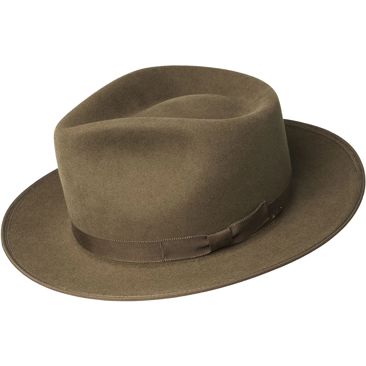 The Cavalier is a superior fur felt with a raised front teardrop crown and 2 5/8″ Brim. It is trimmed with a Japanese grosgrain ribbon band and bound edge. It is fully lined and is finished with a leather sweatband.