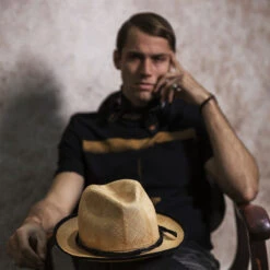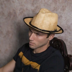 The Clafin is a classic Genuine Panama Fedora that features a unique tie dye appearance. It utilizes a tie dye technique that has a tea stain-like appearance, while the black binding around the edges of the brim give it a cool edge. It is finished with a twisted and wrapped leather band around the crown and a fine woven sweatband.