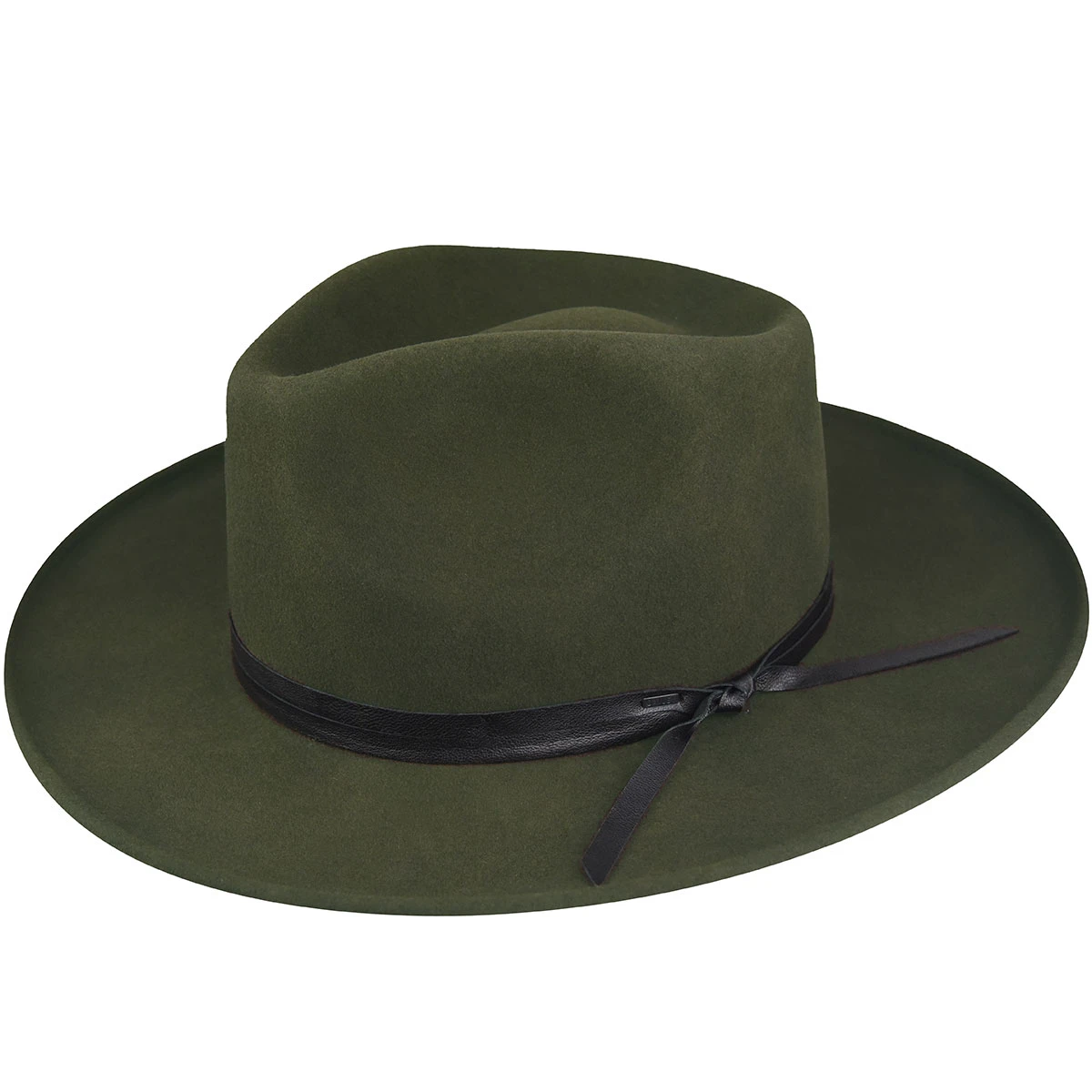 With a raised front teardrop crown, Colvin has a 3-1/4″ brim with a slight curl, and is trimmed with a thin leather band that we’ve wrapped around twice and knotted for a fashionable flair. It’s soft wool offers a natural feel. Colvin provides reliable protection from the wind and rain, and is the perfect cold weather hat.