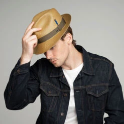 The Bailey 1922 Cosmo LiteStraw® Fedora is made with Shantung LiteStraw®. This spring and summer straw fedora features a grad crown, a 2 1/4″ snap brim, and a fine woven sweatband. The Cosmo has a really cool Japanese grosgrain hatband with a wrapped vintage flooring nail detail. The Cosmo is part of the Bailey 1922 Breed collection of hats that embody a forward-thinking, creative spirit. Made in the U.S.A. of Globally Sourced Components.