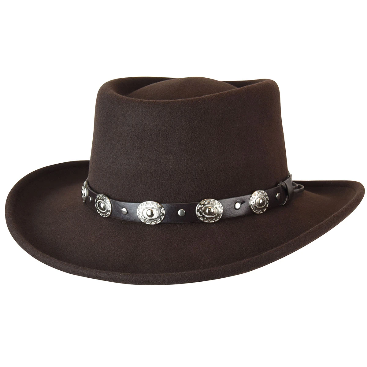 The “gambler” is a classic headwear shape (just ask any hat enthusiast), and one with a very rustic American aesthetic. The Eddy Bros.® Gambler boasts a narrow 3 1/8″ upturned brim, a 4″ gambler crown, and a gorgeous black leather band with large silver conchos.