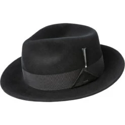 Ellett is a severe pinch front crown shape in our Elite Finsh. We finished it with a wide Japanese grosgrain ribbon and our double triangle fold. A Black dipped flooring nail is gently tucked into the band.
