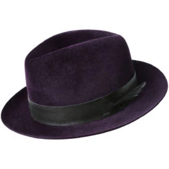 The Flume is a pinch front crown fedora with a classic snap brim. It is crafted out of a plush fur velour body and trimmed with a contrasting smooth leather band. This hat includes a removable feather, is fully lined, and has a fine woven sweatband.