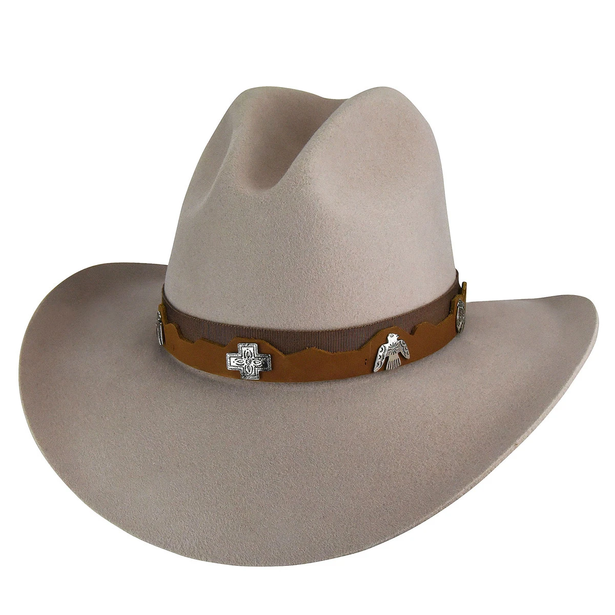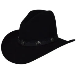 Hobson is a thoughtfully designed, Gus shaped hat with a 3.5″ brim in Black and Mist colorways. It is adorned with a grosgrain and leather band decorated with southwest-inspired conchos. Made in the U.S.A.