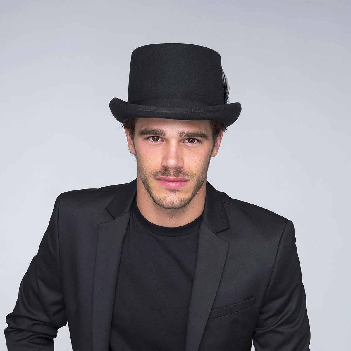 The Ice is a vintage tall crown style with a roll brim with binding in our classic stiffened wool felt body. It features a grosgrain bow, a removable feather, is fully lined, and has a comfort sweatband. Made in the U.S.A.