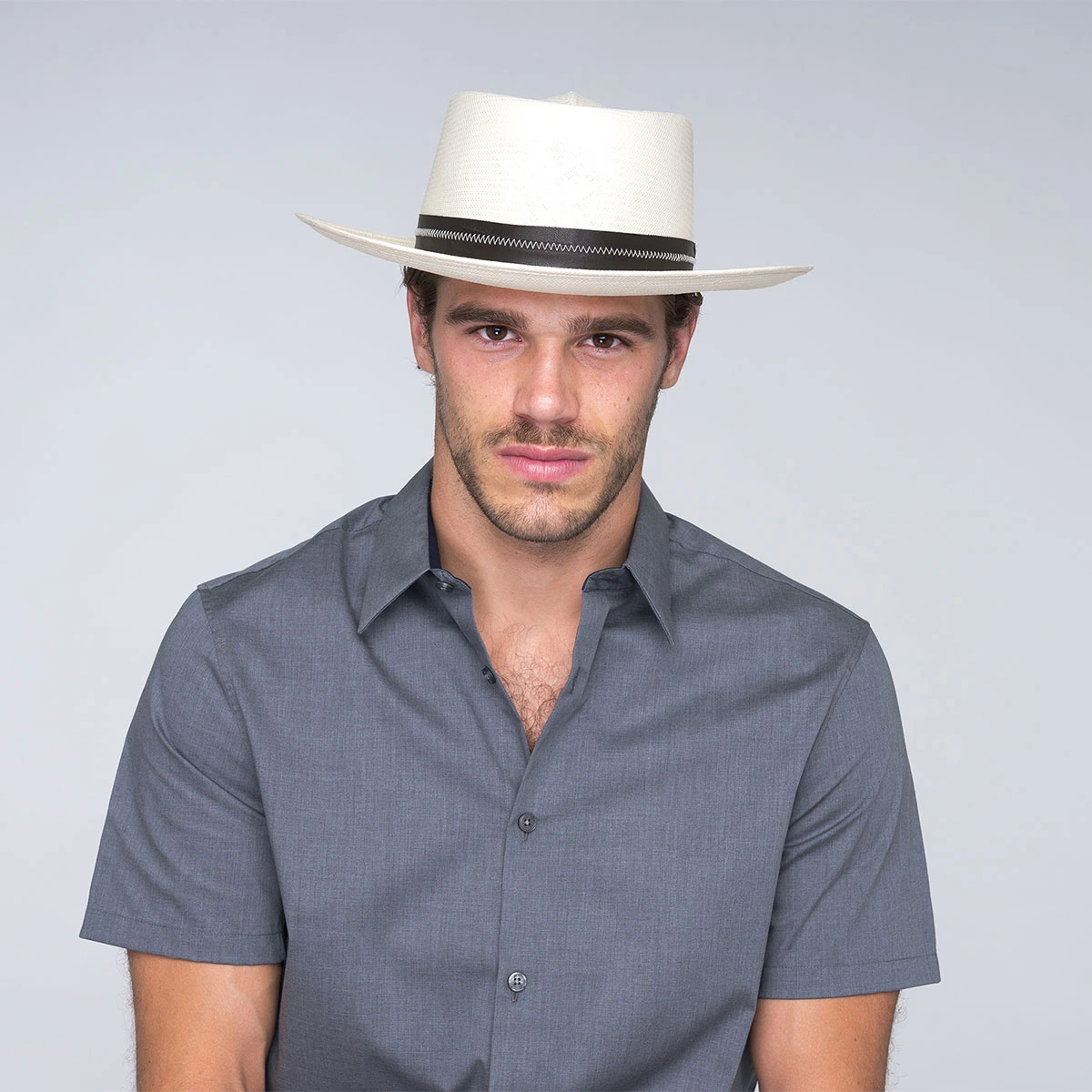 The Largo is a wide brim pork pie that is trendy and modern. The snap brim is accented with a buttery leather tape band with a contrast color zig-zag stitch detail. There is an embroidery on the center-back brim that is the I Ching symbol for “Fire”. The Largo is a statement piece that will give you a fiery entrance for any event. The Largo features the our LiteStraw® finish that makes it durable, flexible, and water repellent.