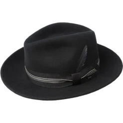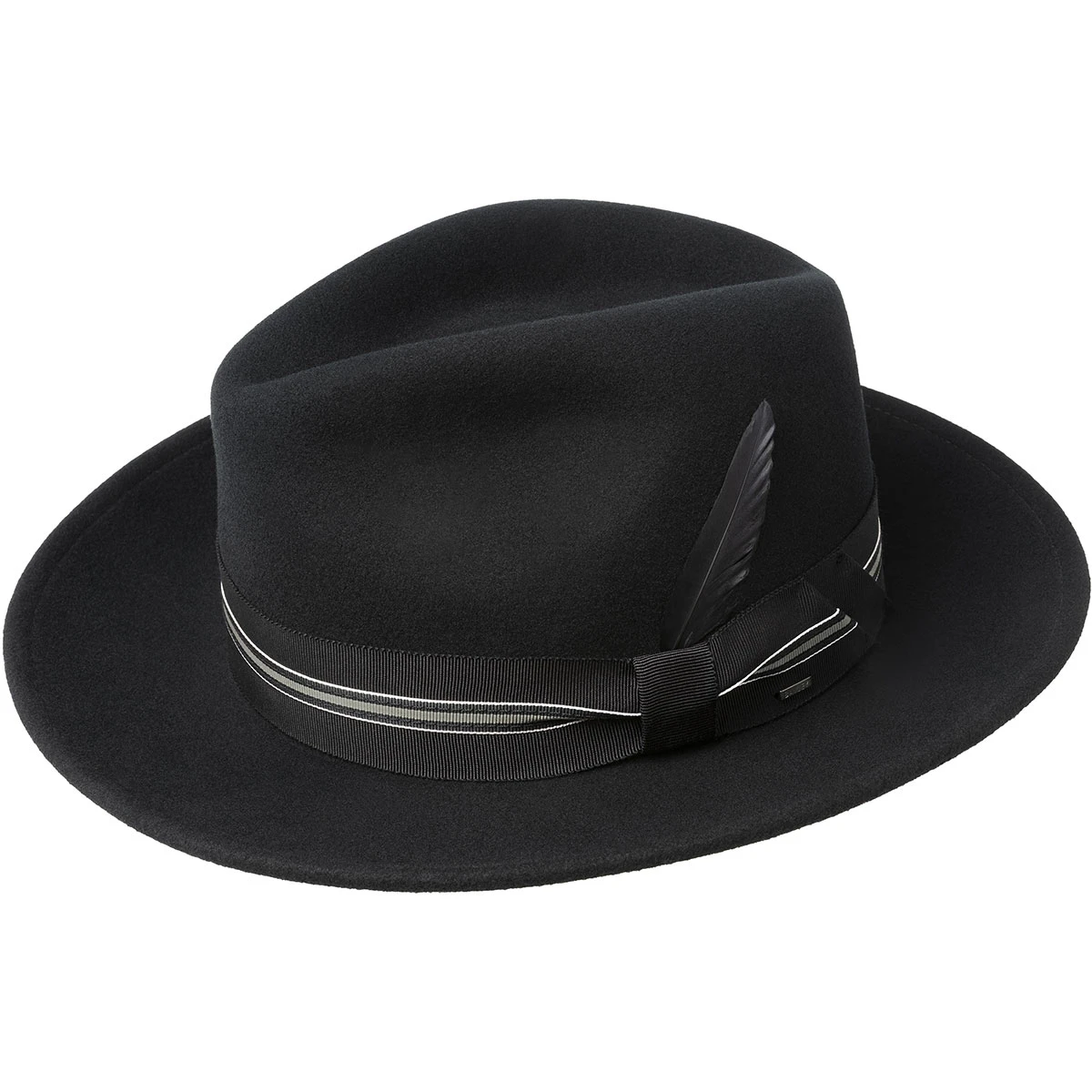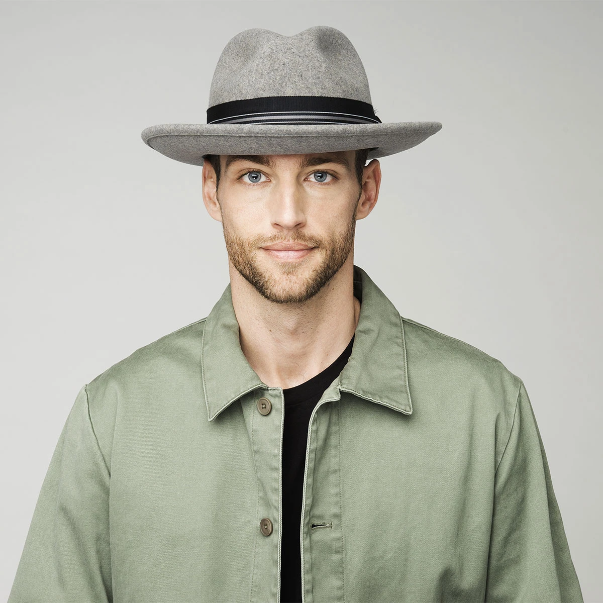 Marack is a Long Teardrop Crown with a snap brim in our water repellent, shape retentive LiteFelt® body. We used a wide solid Japanese grosgrain ribbon and put a striped ribbon over it for added dimension. The ends are done doubled to give it a modern look. A black feather is gently tucked behind for added class.