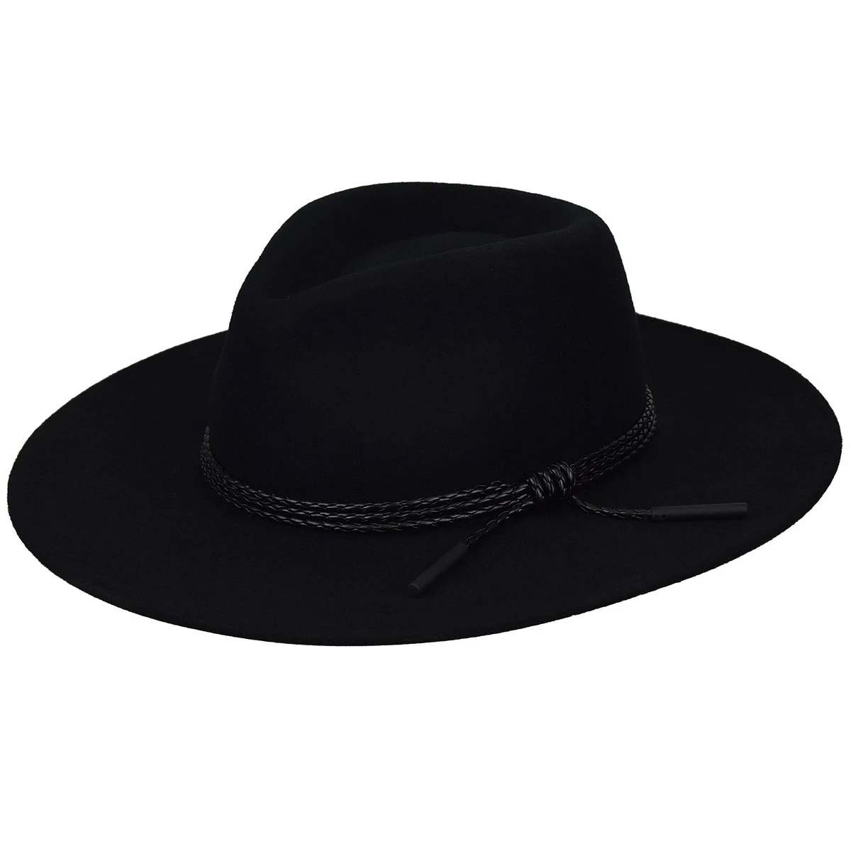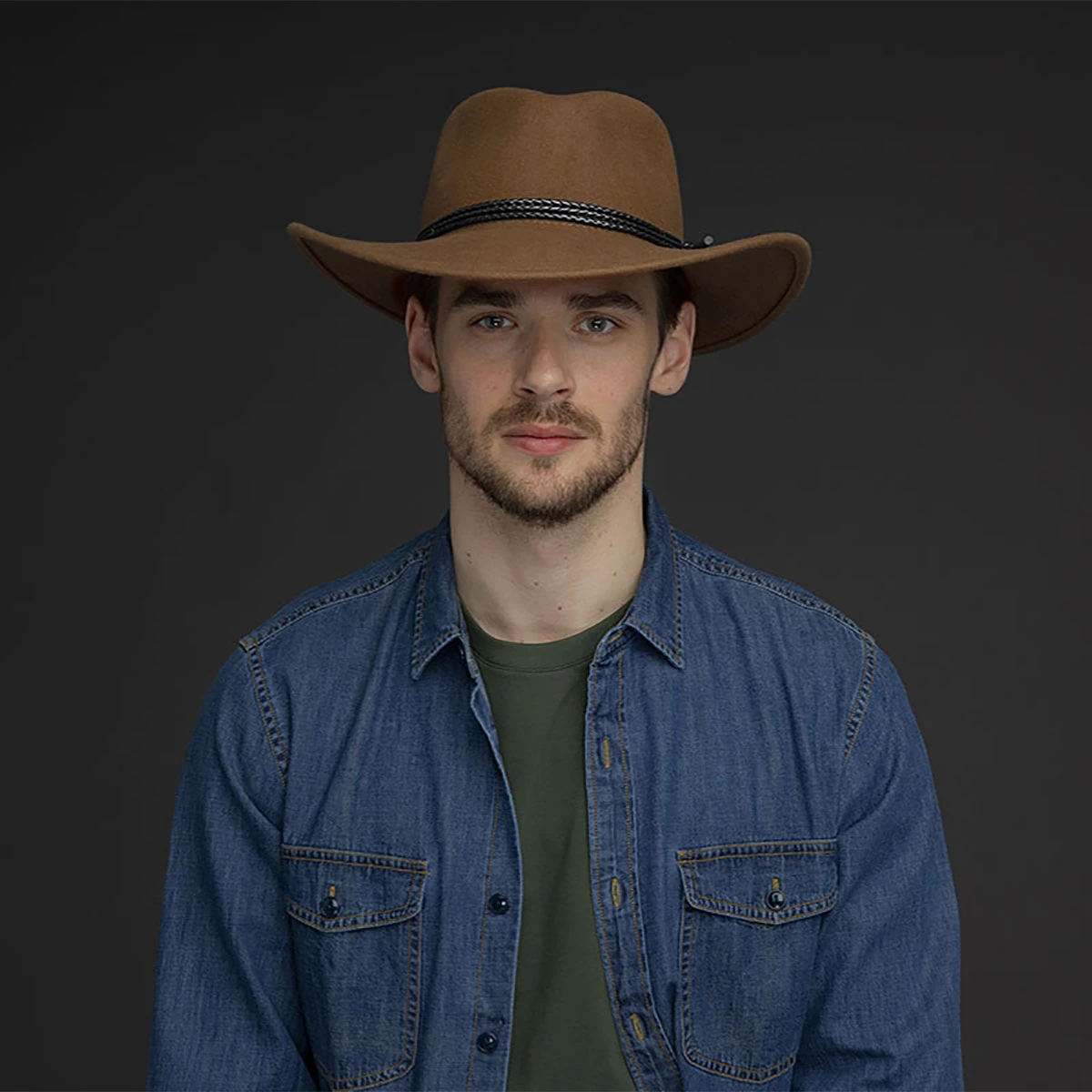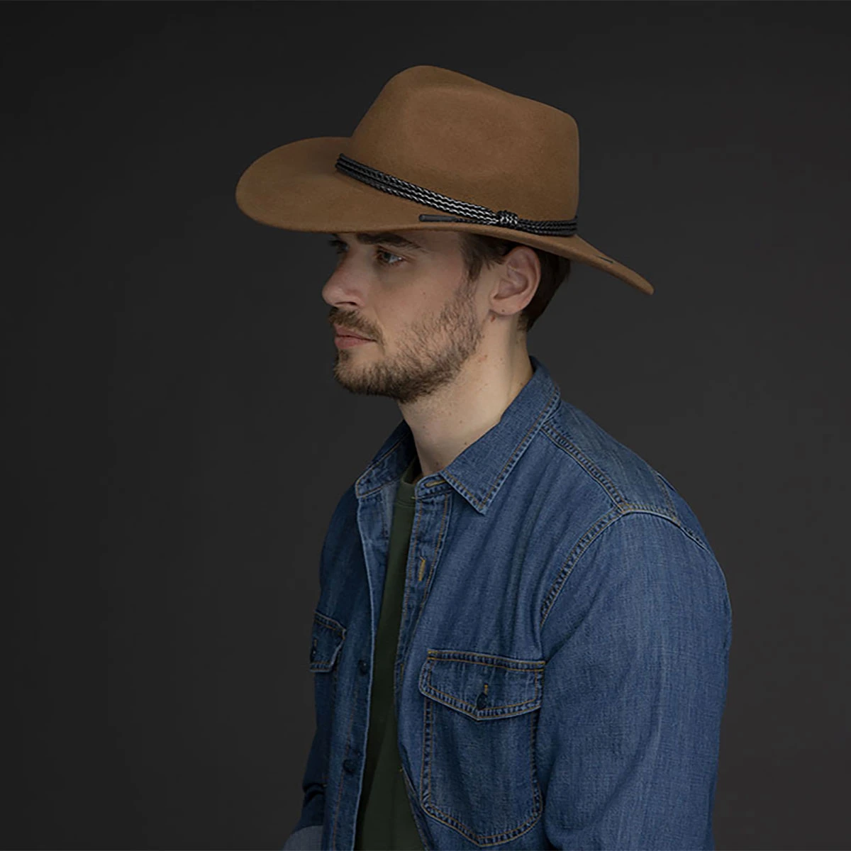 Piston is a Teardrop Crown paired with a wide 3 1/4″ Brim. This hat is blocked out of a soft Wool Felt and trimmed with a vegan leather bolo cord with metal tips. It is fully lined and finished with a Comfort Sweatband.