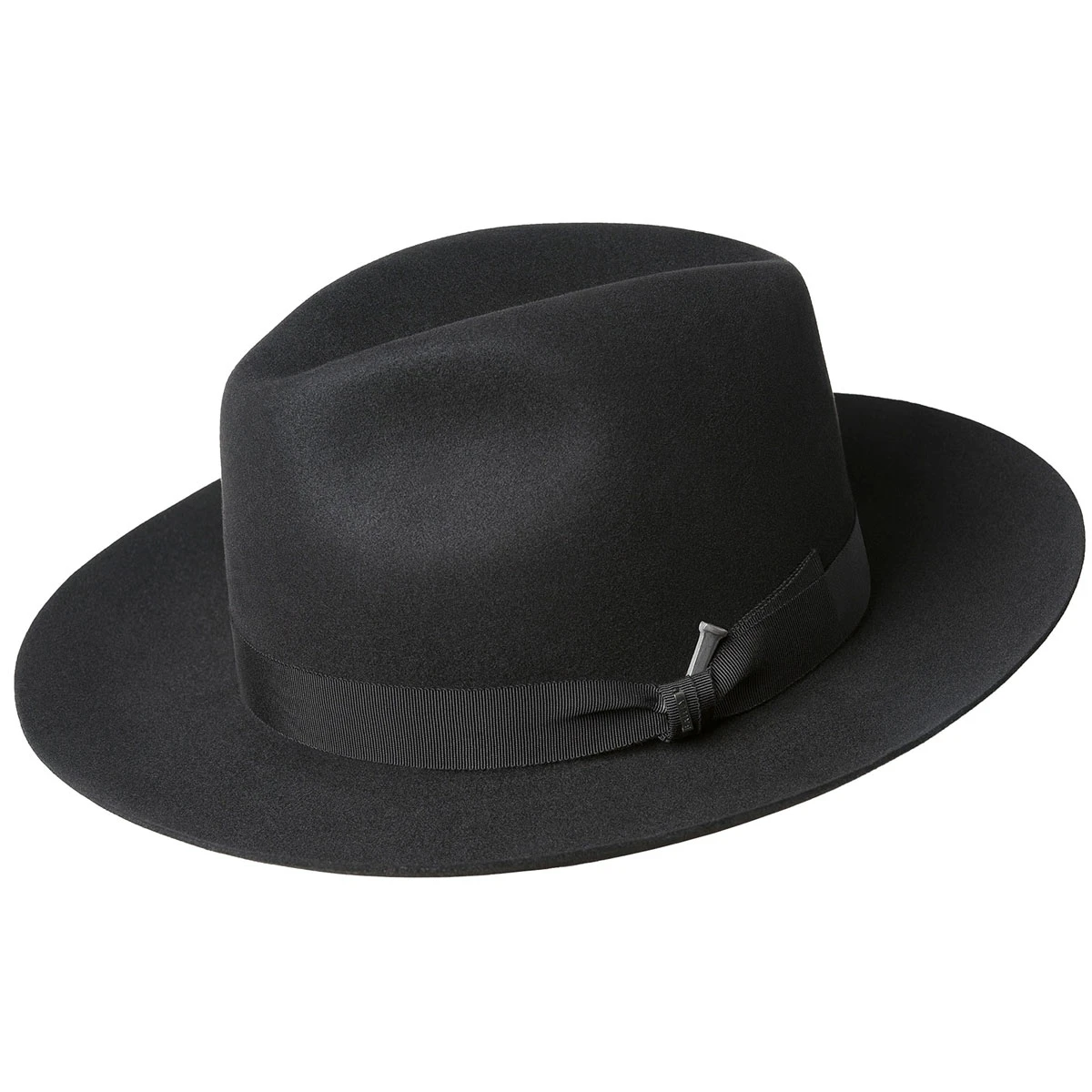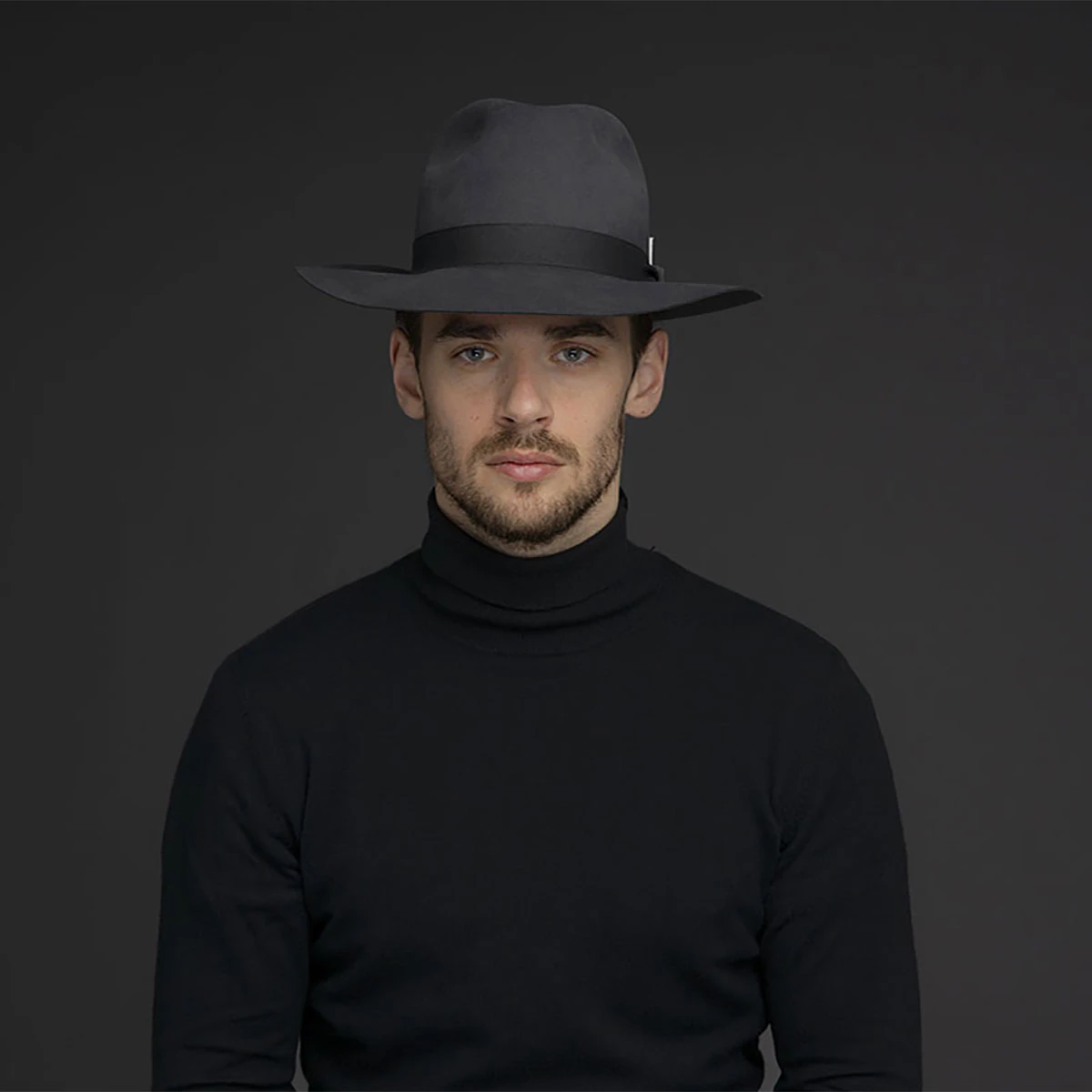 The Ralat is a pinch front crown fedora with a fashionable wide brim. It is crafted out of Bailey’s finest Superior Fur Felt body. Trimmed with a Japanese grosgrain band with a vintage flooring nail detail. This hat is fully lined with a fine woven sweatband.