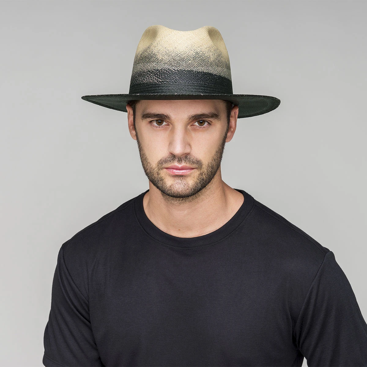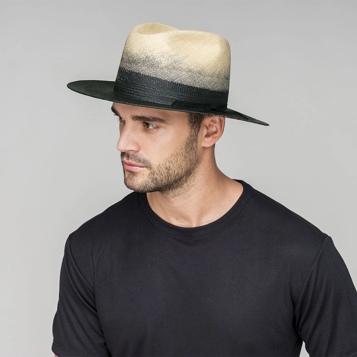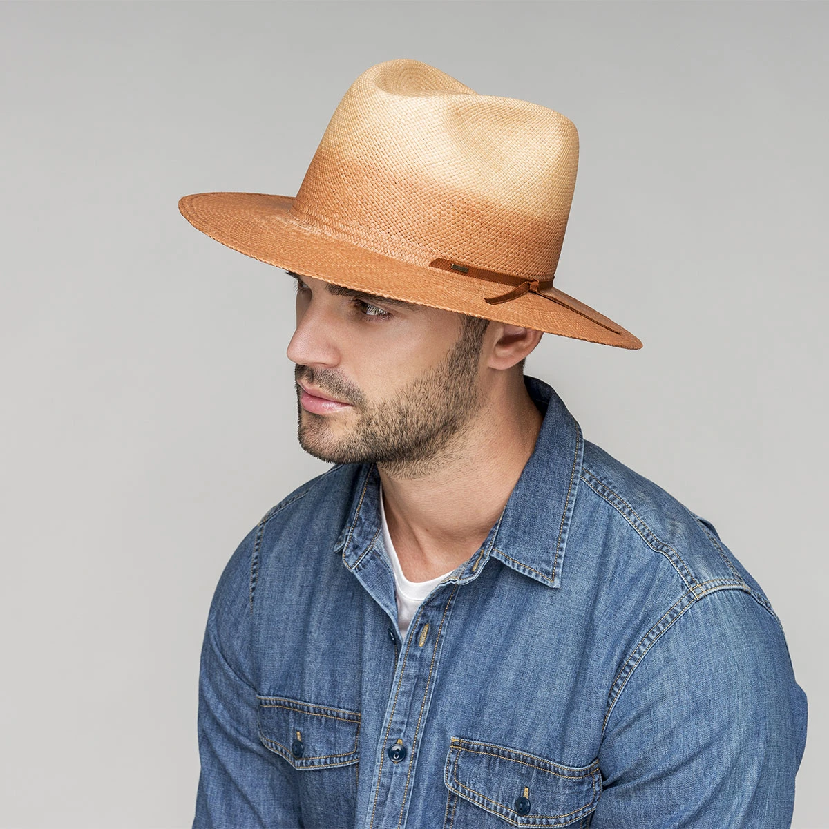 With a deep 4 1/2″pinch front crown and 3″ brim, this genuine hand-woven Panama hat is made using a gradation process that results in an awesome meshing of color. The hat is trimmed with a Japanese grosgrain band and a finely woven sweatband, providing the utmost in style and comfort.