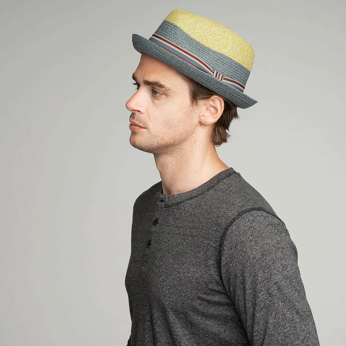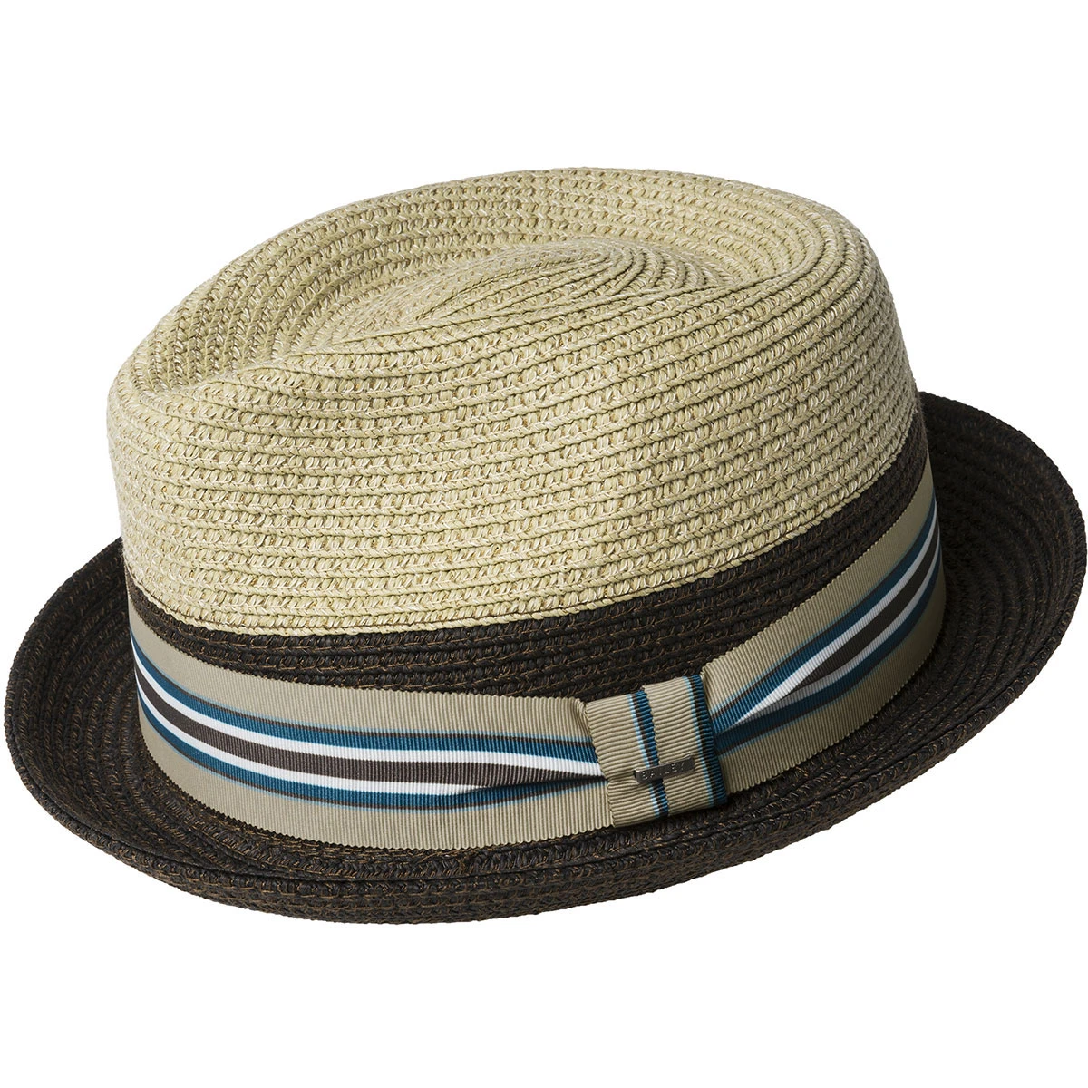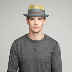 The Rokit is an energetic spring and summer trilby with its colorblocked braided appearance. It features a contrast color crown and a vibrant multicolored striped grosgrain hatband. The Rokit trilby has a stingy snap brim, a teardrop crown, and a comfort sweatband. Proudly show off your creative, original, free-thinking spirit with this best selling trilby. The Rokit is imported.