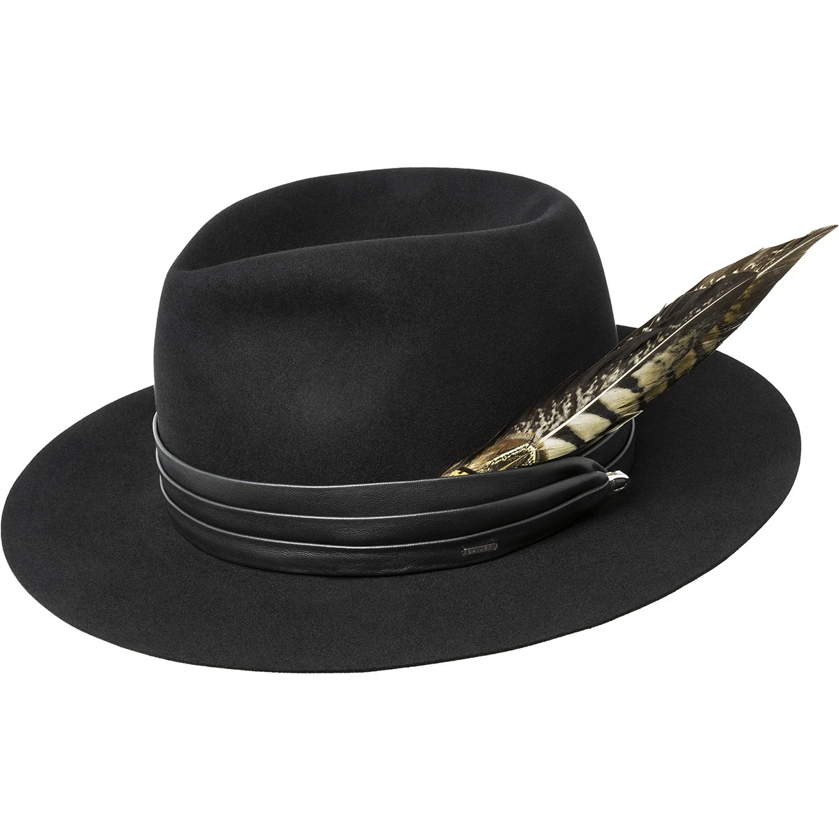 The Trinell combines old world details with modern materials for a unique look. The lambskin pug band is hand pleated and finished with a delicate metal tip. A custom feather combination was made for this season to dress this style with drama.