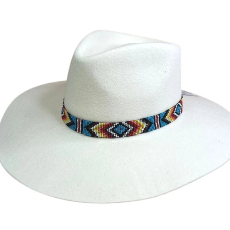 Dress up your favorite hat with this beaded hatband.Stretch to fit in a southwestern pattern of multi colored beads.