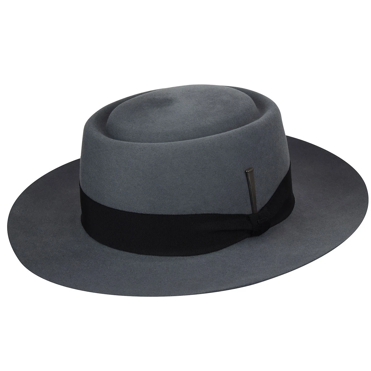 The Walsh is a new rounded pork pie shape in Baileys ‘fur like’ polished Elite Stiffened finish. This luxurious hat features a 3″ ‘tabletop’ brim and completed with Japanese grosgrain trim and vintage flooring nail. It is finished with a goatskin leather sweatband and is fully lined.