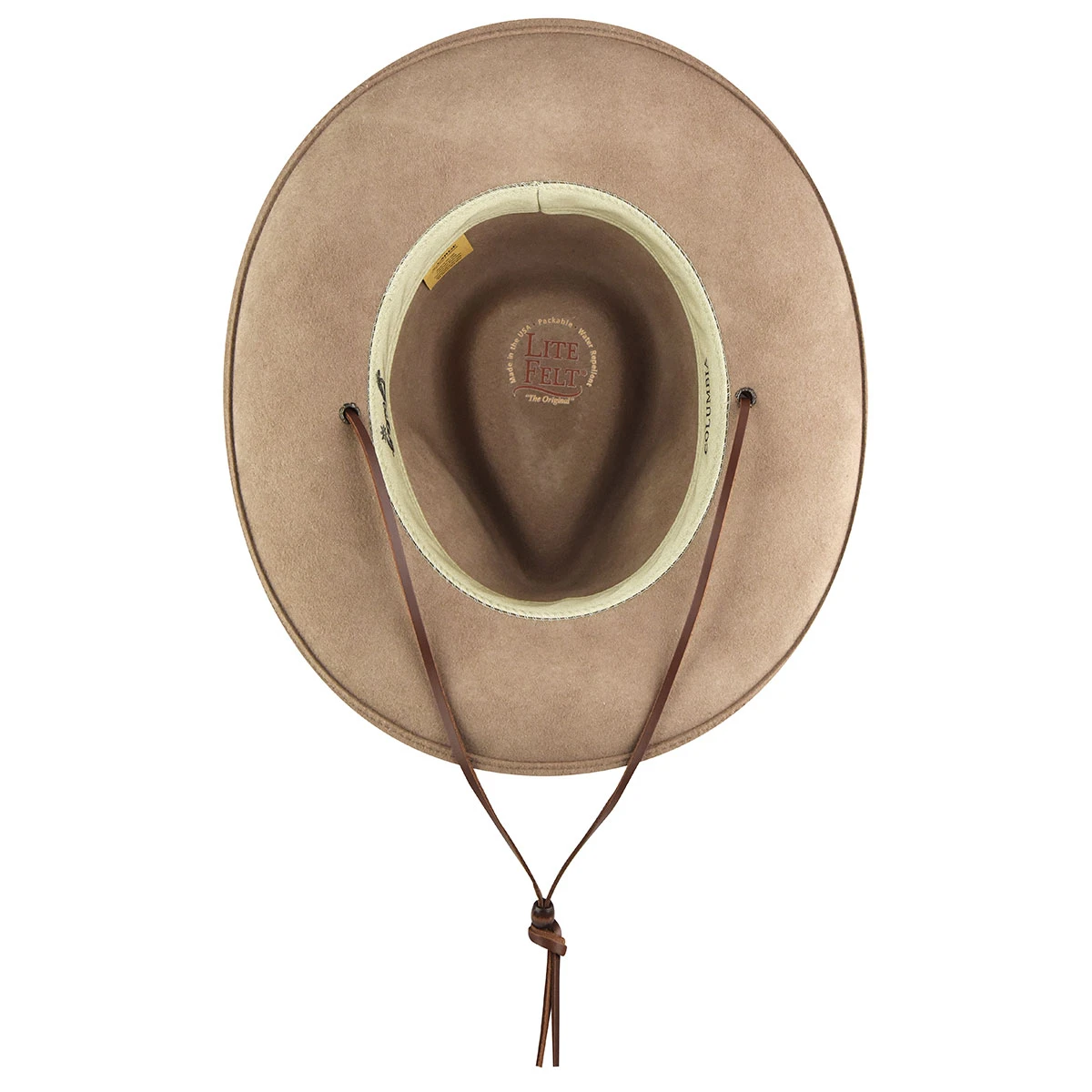 Our Columbia LiteFelt® outback is a low-profile pinch front cassidy crown hat featuring our shape retentive, water repellent, durable LiteFelt® material. The Wind River® by Bailey® Columbia Outback features a wrapped leather hatband that goes through the brim and turns into a chinstrap with a wooden bead adjuster. Although it is not lined, it is finished with a Dri-Lex® sweatband for all day comfort and to wick away moisture.